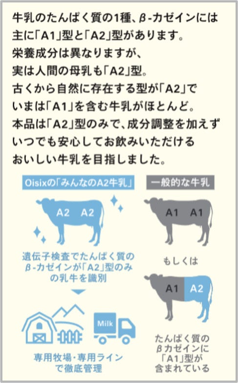 Oisixでは2024年2月28日より、A2牛乳を証明する認証(スイスの食品検査会社 SwissDeCode が提供)を取得した牛乳の取扱いを開始。2025年4月末現在で累計82万本以上を販売し、「A2牛乳のおかげで家族みんなで飲めるようになった」など好評であることから、日本で初めて認証ラベルを使用したプライベートブランドの牛乳として新発売する運びとなりました。