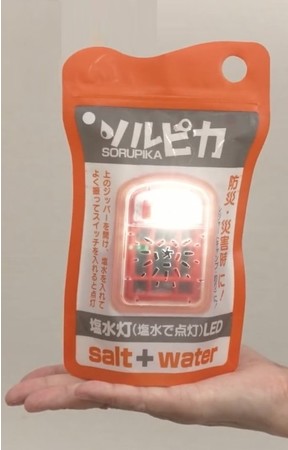 少量の塩と水で発電できる軽量タイプのランタン。海水でも発電可能。