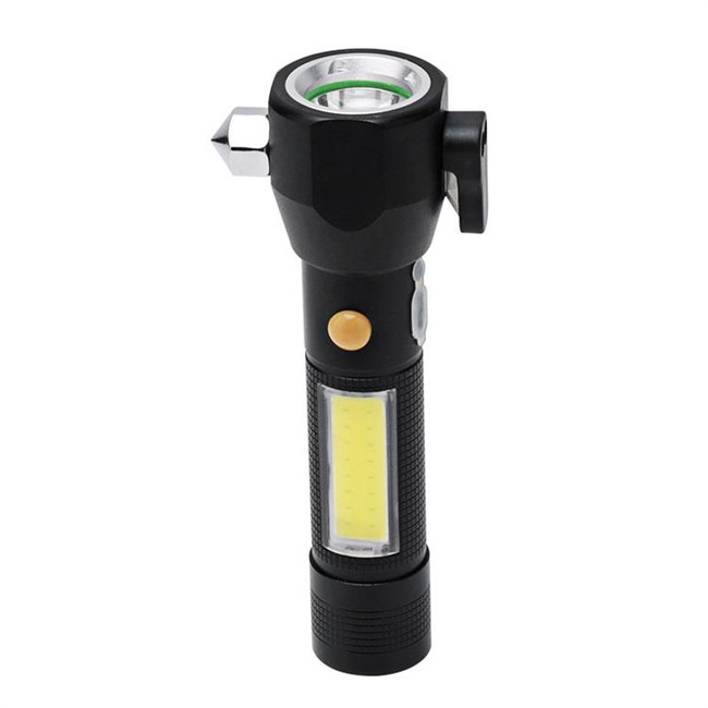 車のガラスを割るための緊急脱出用ハンマー付きライト。シートベルトカッターも兼備。