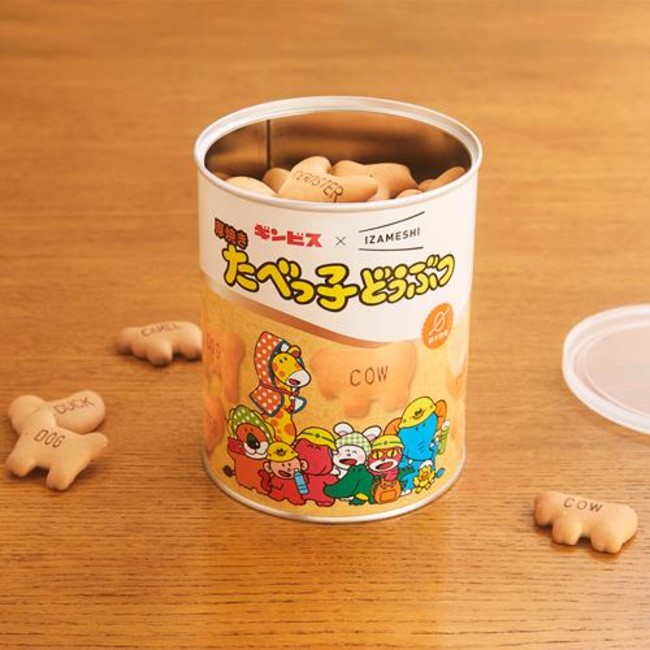 長期保存食「イザメシ」と「たべっ子どうぶつ」のコラボ商品。従来品よりも厚焼きで、香ばしくサクサクとした食感が特徴。(製造から5年保存)
