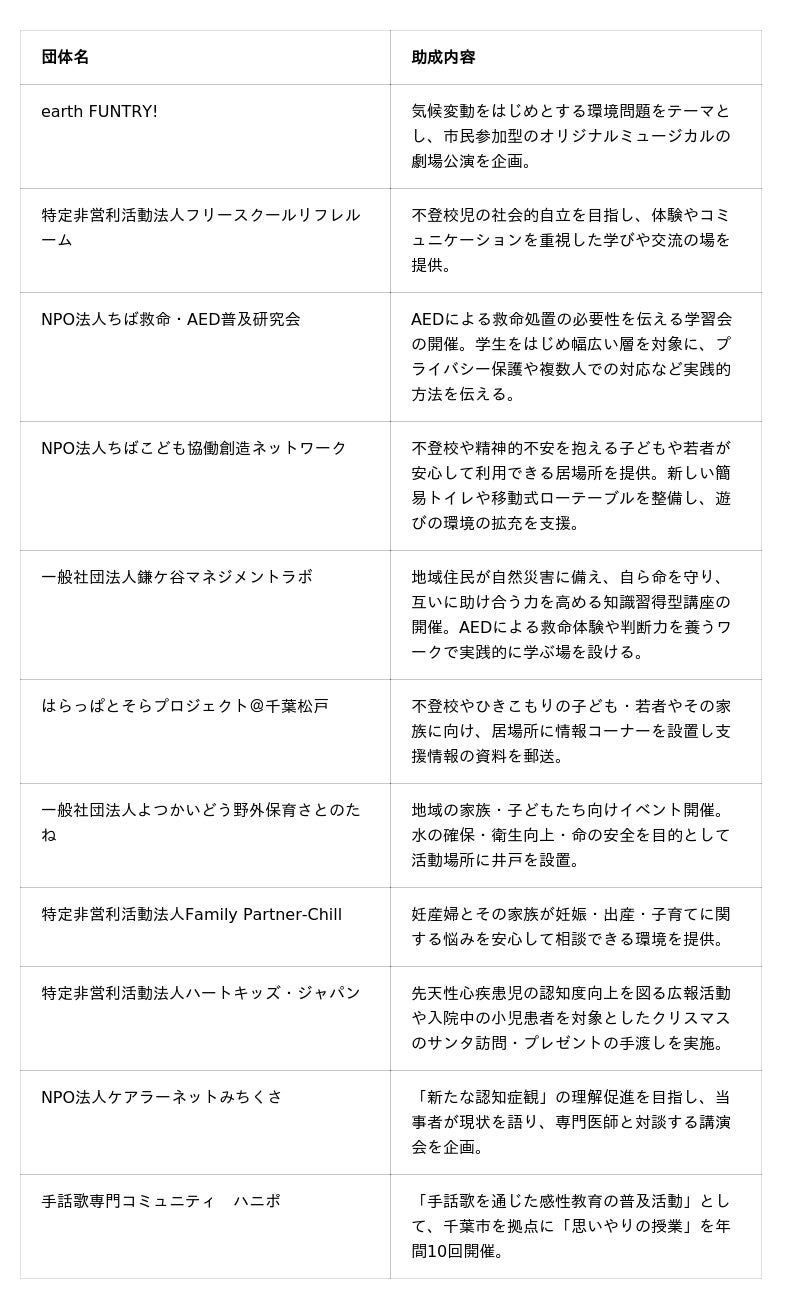 2025年度は36団体から申請を受け、審査を経て11団体へ295万5,718円の助成が決定しました。市民自らによる活動や運動、事業を地域社会に広げ、参加型の地域づくりの継続的な発展に寄与する調査や交流、人材育成にかかる費用を助成します。