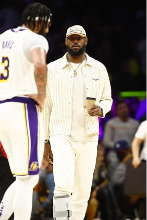 ロサンゼルス・レイカーズ 対 ゴールデンステート・ウォリアーズの試合に登場したレブロン・ジェームズは、ディオールのメンズ コレクションからエクリュカラーのピンストライプ コットンデニム オーバーシャツとコットン&カシミヤのトラックパンツを着用しました。