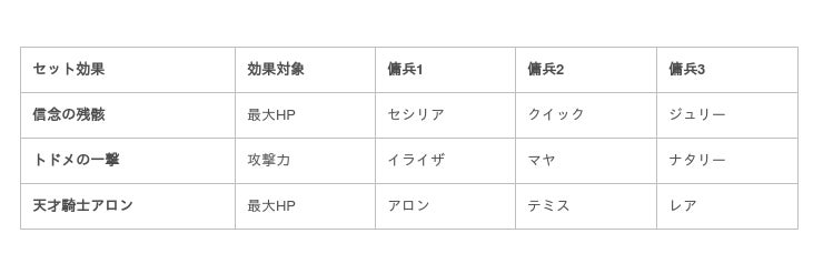 セット効果・3種類を追加しました。セット効果は、特定の傭兵を所持し且つスキル強化をすることで適用されます。