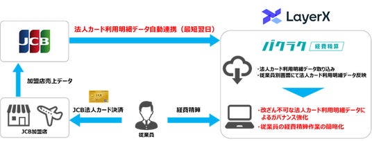 株式会社ジェーシービー (本社:東京都港区、代表取締役兼執行役員社長:二重 孝好、以下:JCB)は、株式会社LayerX(本社:東京都中央区、代表取締役:福島 良典、以下:LayerX)と、業務提携契約を締結し、JCBが提供する「JCB法人カード利用明細データ連携サービス」が、LayerXが提供する経費精算システム「バクラク経費精算」に対応いたしました。