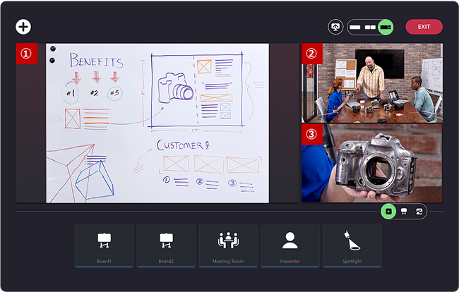 職場に設置されたカメラにむかって特定のハンドジェスチャーをすることで、プレゼンターは注目して欲しい視点の設定、対象のズームインなどのカメラ操作が可能です。また、リモート参加者はドラッグ&ドロップなどの直感的な操作で視点を切り替えることができます。