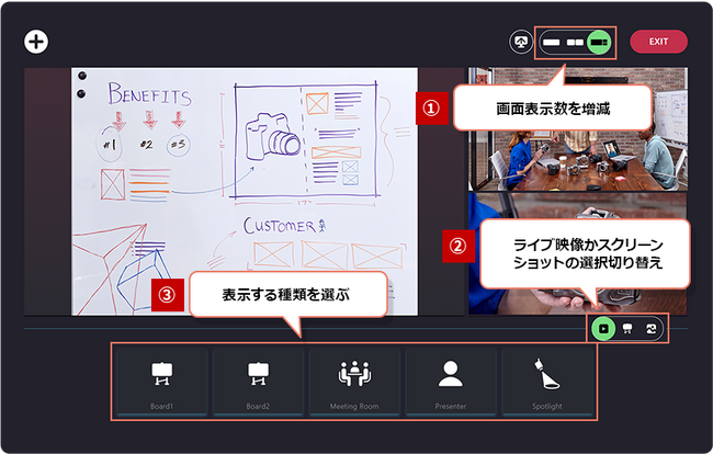職場に設置した1台のカメラから、プレゼンター、ホワイトボード、会議室全体、注目して欲しい視点など、複数のフルHD映像を同時配信することができます。リモート参加者は、プレゼンターの表情、ホワイトボードの内容、会議室内の状況、貼り紙や机上の小物、指定した特定領域などから、最大3つを自由に選択・拡大でき、画面越しでも複数視点で会議に参加することが可能です。加えて、画像処理により斜めに配置したホワイトボードでも補正して正対で表示し、ホワイトボードの前に映り込んだ人物等の映り込みの除去を行うことで、リモート参加者はホワイトボードに描かれたイラストや文字などを鮮明に確認することができます。