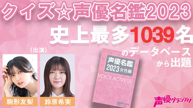 現在発売中の月刊誌『声優グランプリ』最新3月号付録「声優名鑑2023 女性編」では歴代最多となる総勢1039名の女性声優が掲載。「声優名鑑」をデータベースとしたクイズ番組の放送が決定。パーソナリティを務めるのは2023年版にて初掲載となる鈴原希実さん、2013年版に初掲載となった駒形友梨さんのコンビ。『クイズ☆声優名鑑2023』は2月22日(水)20時00分から「声優グランプリチャンネル」(YouTube/ニコニコ)にて全編無料で生放送!