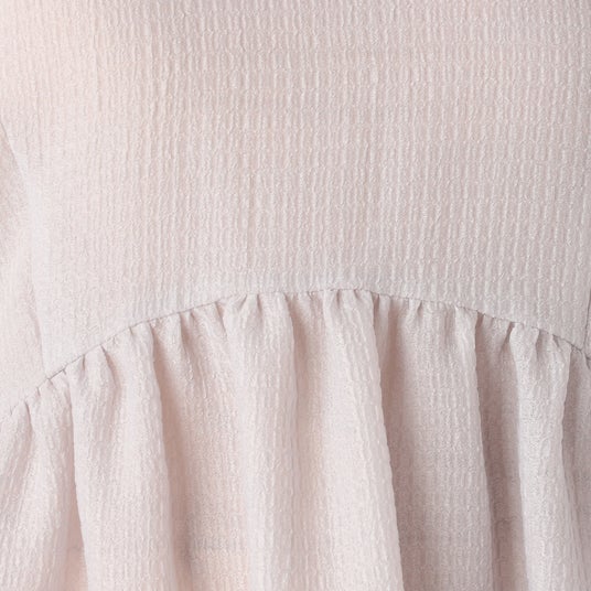 ・立体感のあるパフスリーブや、光沢感のあるサテンパイピングを襟ぐりに使用することで、大人の甘さをプラスしました。
