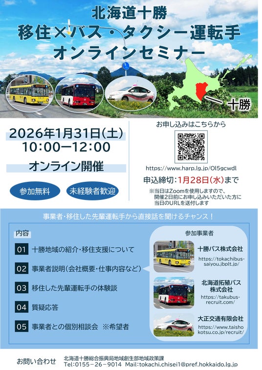 バス・タクシー運転手に興味のある管外在住の方を対象に、管内交通事業者の会社概要や仕事内容について発信するオンラインセミナーを開催します。