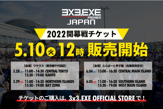 ゼビオグループのクロススポーツマーケティング株式会社(本社:東京都千代田区 代表取締役社長:中村 考昭)が運営する3人制バスケットボールのグローバルリーグ「3x3.EXE PREMIER」は、5月28日(土)~29日(日)にワテラス(東京都千代田区)、6月4日(土)~5日(日)にららぽーと甲子園(兵庫県西宮市)で行われる「3x3.EXE PREMIER JAPAN 2022」男子開幕戦の観戦チケットを5月10日(火)12:00より、「3x3.EXE OFFICIAL STORE」で販売を開始いたします。