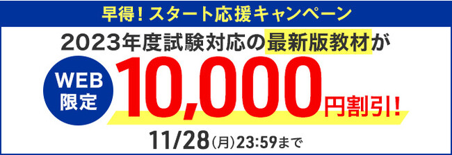 2022年11月28日(月)23:59まで、WEBからのお申込み限定で、最新版教材の宅建士講座の受講料を10,000円割引いたします。