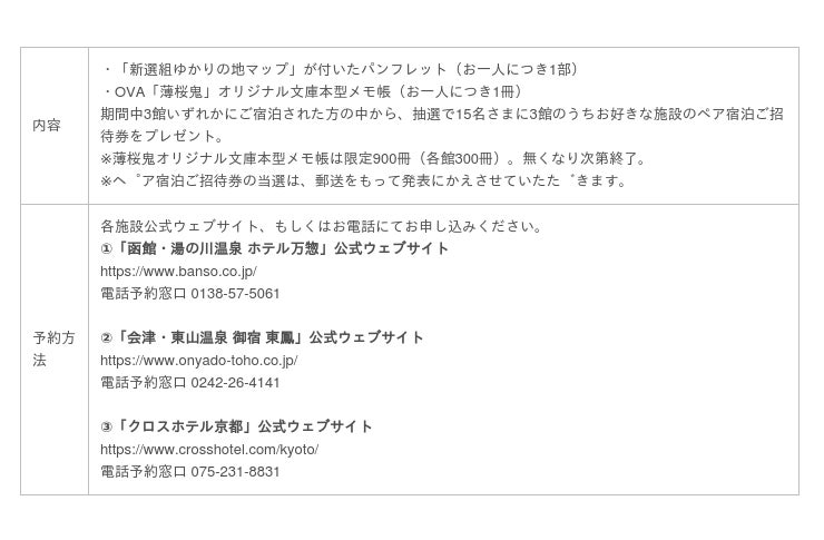 OVA「薄桜鬼」に登場する新選組の隊士「土方歳三」「沖田総司」「斎藤一」が紹介するオリジナルマップ「新選組ゆかりの地マップ」とOVA「薄桜鬼」の主要キャラクターが表紙を飾る「OVA「薄桜鬼」オリジナル文庫本型メモ帳」が付いた宿泊プランです。