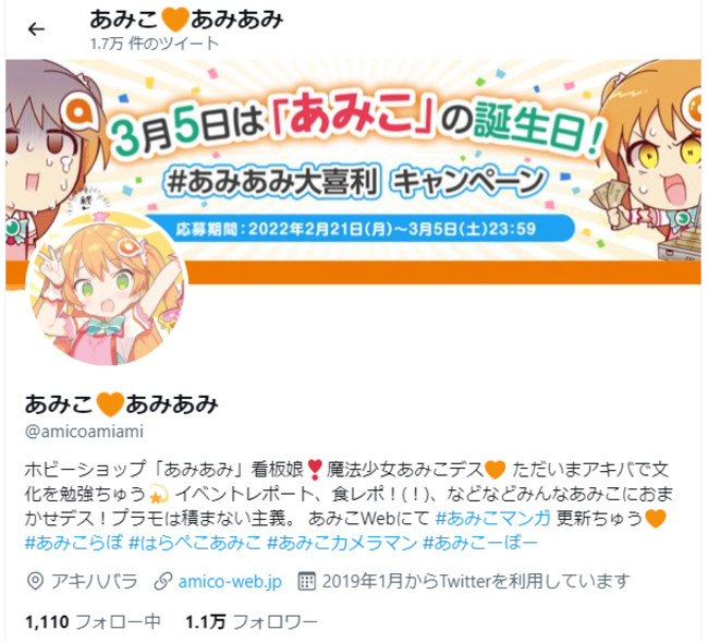 「あみこ」は、2019年1月29日から公式Twitterアカウント(@amicoamiami)をスタート。「あみこ」が、マニアックなホビー情報から、ゆるーい日常の様子までをTwitterで情報発信し、昨年12月にフォロワー10,000人を突破いたしました。あみこアカウントが画像&動画で紹介するホビー情報は、ホビーのビギナーからベテランの方まで、幅広くご好評いただいています。
