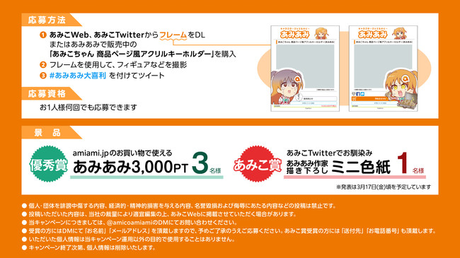 あみこWebまたはあみこTwitterからフレームをダウンロード、またはあみあみで販売中の「あみこちゃん 商品ページ風アクリルキーホルダー」を購入していただき、フレームを使用して、フィギュアなどを撮影してください。『#あみあみ大喜利』を付けてツイートで、キャンペーン参加完了です。みなさまの、楽しいあみあみ大喜利をお待ちしております!