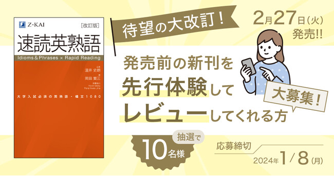 株式会社増進会ホールディングス(Z会グループ)のグループ会社、株式会社Z会ソリューションズは、長年愛され続けている『速読英熟語』の改訂を2024年2月27日(火)に予定しています。今回は、発売前の本品をお試し&レビューしていただける方を募集するキャンペーンを実施し、抽選で10名の方に実際に先行して体験いただきます。