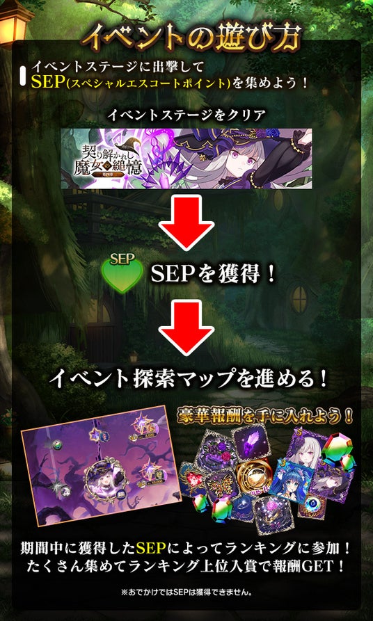 イベントステージを遊ぶと獲得できる「SEP(スペシャルエスコートポイント)」を集めることでイベント探索マップを進めることができます。