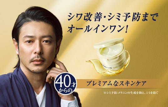 オダギリジョーさんが出演する新ビジュアルを、8月1日よりWEB上にて公開します。加齢に伴う肌悩みを1品で対策するプレミアムなオールインワン商品であることを、ゴールドの世界観と共に表現しています。