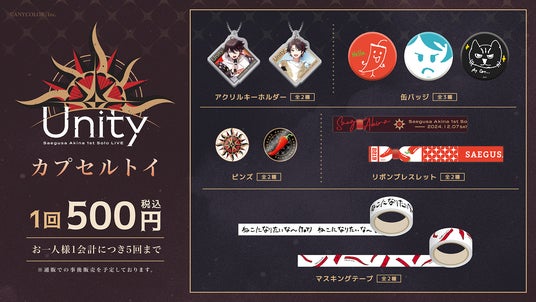 ANYCOLOR株式会社(本社:東京都港区 代表取締役:田角陸、以下「当社」)が運営するVTuber / バーチャルライバーグループ「にじさんじ」は、「Saegusa Akina 1st Solo LIVE "Unity"」グッズの事前販売を2024年11月5日(火)18時からにじさんじオフィシャルストアにて開始いたします。