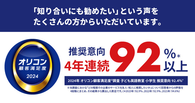 2024年 オリコン顧客満足度(R)調査 子ども英語教室 小学生 推奨意向92.4%※