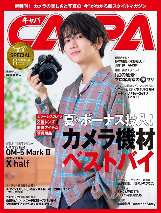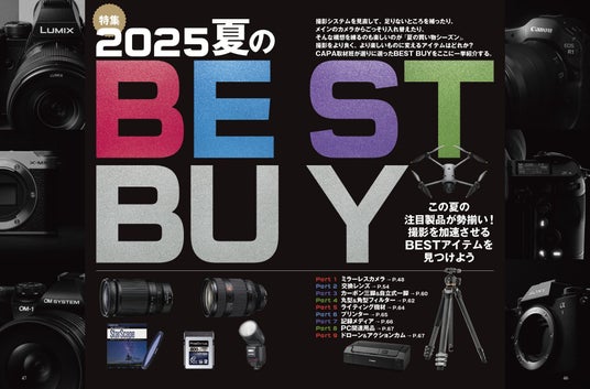 巻頭特集は「2025夏のベストバイ」。カメラ、レンズ、撮影アイテム、いま“買い”の製品をジャンルごとに紹介します。撮影テクニック特集は、悪天候を味方に「”虹の風景”プロ写真家たちのマル秘ワザ」をお届け。撮影のカギはPLフィルターの活用です。このほか、新型カメラ実写レビューではOM SYSTEM OM-5 MarkIIと富士フイルムX halfを紹介します。CAPA 8月号Summerもカメラ・写真を楽しむための記事が満載です。