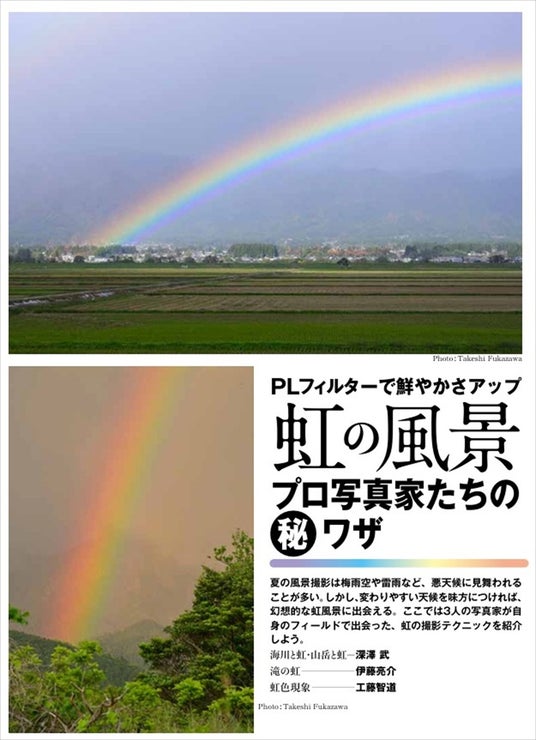 夏の風景撮影は梅雨空や雷雨など、悪天候に見舞われることが多いもの。しかし、変わりやすい天候を味方につければ、幻想的な虹風景に出会えます。ここでは3人の風景写真家が自身のフィールドで出会った虹の撮影テクニックを公開。「海川・山岳」は深澤武さん、「滝」は伊藤亮介さん、「虹色現象」は工藤智道さんが解説します。
