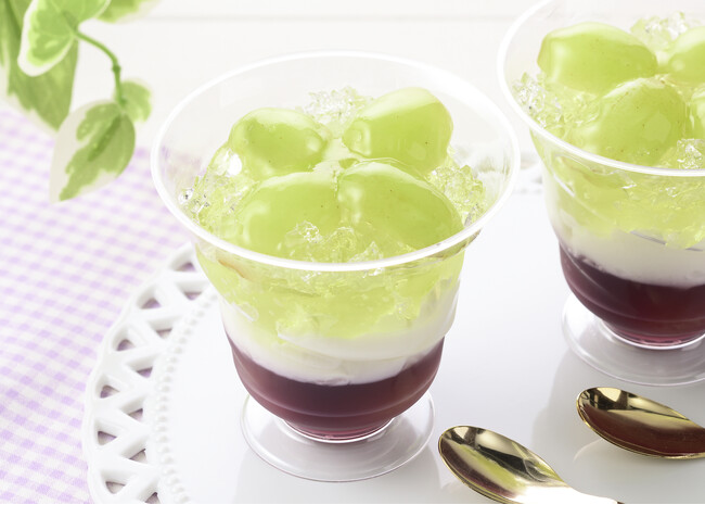 芳醇なぶどうのおいしさを爽やかに味わう、ゼリー仕立てのデザートです。赤&白、2種のぶどうゼリーとやさしい味わいのミルクゼリーを重ねて、クラッシュゼリーと白ぶどうをトッピングしました。つるんとのどごしのよいゼリーとともに、涼やかなスイーツタイムをお過ごしください。