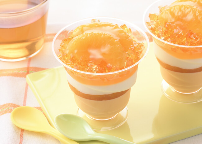 オレンジムース、オレンジジャム、ヨーグルト風味ムースを重ねてオレンジジュレと柑橘風味のクラッシュゼリーをのせ、オレンジの果肉をトッピング。オレンジの爽やかな香りと、スッキリとした甘さが心地よい、カップデザート。