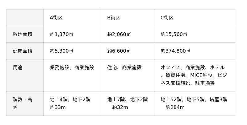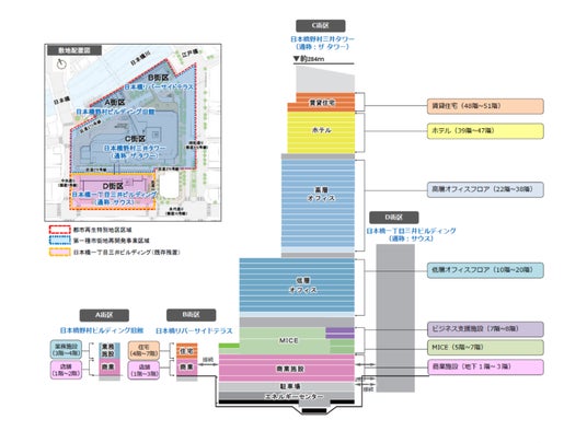 本事業はA・B・C・Dの4街区で構成され、それぞれが個性を持ちながら一体となって、日本橋の新たな国際都市景観を描きます。各街区の建物名称についても以下のとおり決定いたしました。