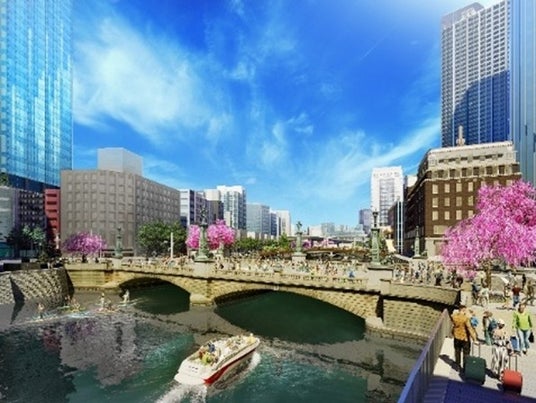 江戸橋上空から首都高速道路の高架橋が撤去された『日本橋リバーウォーク』を望む※