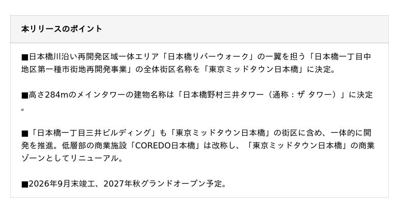 三井不動産株式会社(本社:東京都中央区 代表取締役社長:植田俊、以下「三井不動産」)および野村不動産株式会社(本社:東京都港区、代表取締役社長 松尾大作、以下「野村不動産」)は、参画している日本橋一丁目中地区第一種市街地再開発事業の全体街区名称を「東京ミッドタウン日本橋」に決定しましたのでお知らせいたします。本事業は2026年9月末に竣工し、2027年秋のグランドオープンを予定しています。