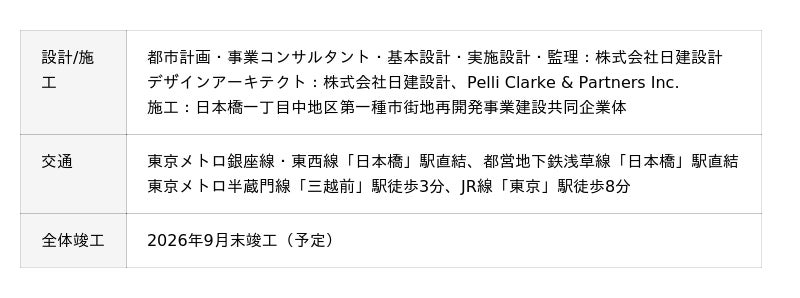 日本橋一丁目三井ビルディング地下1階から4階の「COREDO日本橋」は2026年10月をもって閉館し、「東京ミッドタウン日本橋」の商業ゾーンとして2027年秋にリニューアルオープンいたします。