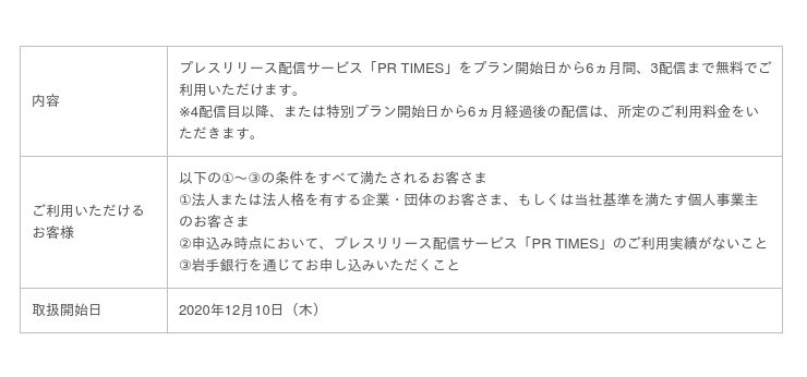 岩手銀行の対象取引先に利用開始から6ヵ月間で3回までプレスリリース配信を無料で提供することで、岩手県企業・団体・個人事業主の有益なニュースを全国に発信しやすくする環境づくりを、両社で進めてまいります。