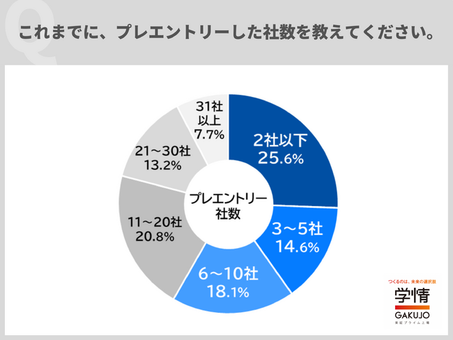 これまで「プレエントリー」した社数について、「2社以下」と回答した学生が25.6%に上りました。4人に1人は、「2社以下」と回答しています。「3~5社」14.6%、「6~10社」18.1%となっており、「10社以下」と回答した学生が6割に迫りました。