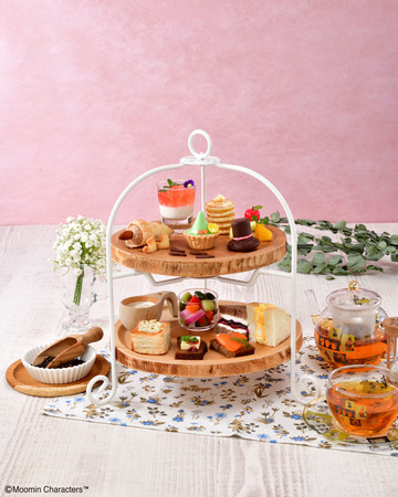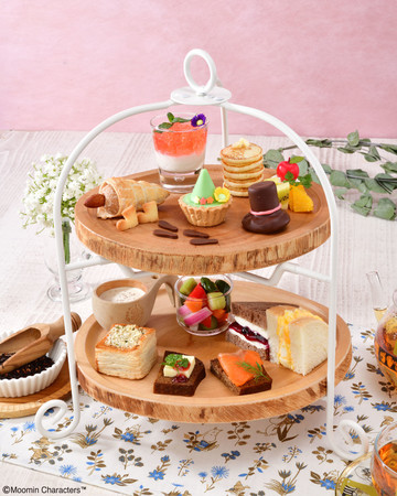 北欧の雰囲気が漂う木製プレートを使用した二段のティースタンドで、上段「ムーミン谷の仲間たち」と下段「北欧フィンランド」の二種類をテーマにしたデザートや軽食をお楽しみいただけます。