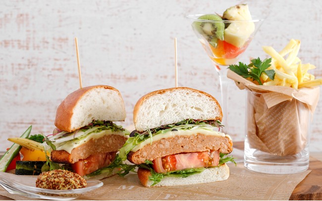 大豆ミートのパティに野菜とチーズをサンドし、マスタードとケチャップでシンプルに味付けをしたボリュームのあるハンバーガーです。大豆ミートを使用しているのであっさりとお召し上がりいただけます。