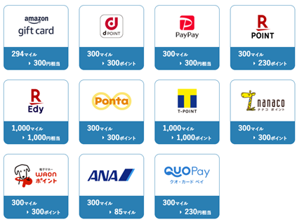 貯まったマイルを、他社の電子マネーやポイント、デジタルギフトへ交換することもできます。