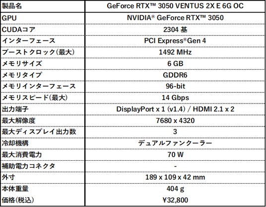 ■ GeForce RTX(TM) 3050 VENTUS 2X E 6G OC