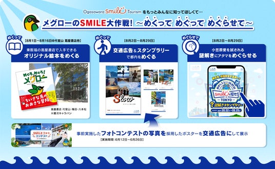 全国各地で旅行やお出かけの機会が増える夏休みに合わせ、2024年8月1日(木)より、「Ogasawara SMILE Tourism」を楽しみながら知ってもらうためのオリジナル絵本の販売や交通広告を通じた謎解きスタンプラリーなど、「メグローのSMILE大作戦!~めくって めぐって めぐらせて~」と名付けた展開を蔦屋書店や都営交通にて開始いたします。