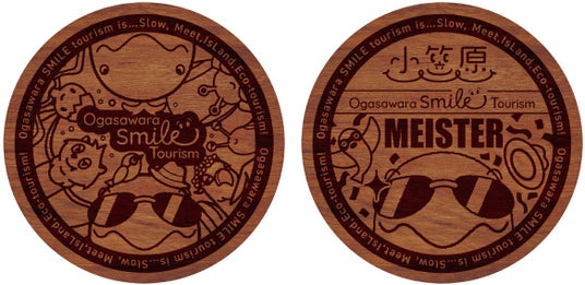 小笠原本来の森林生態系を取り戻すために伐採された外来植物アカギを利活用して製作した木製コースターに「小笠原マイスター」の刻印がされた特別デザインの認定証。数量限定、先着順でプレゼントいたします。