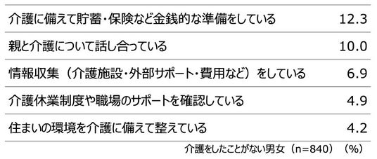 将来の介護に備えて準備している内容を聞くと、「介護に備えて貯蓄・保険など金銭的な準備をしている」12.3%、「親と介護について話し合っている」10.0%でしたが、実践率は1 割程度にとどまっています。