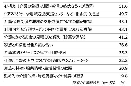 また、当時を振り返り準備しておけばよかったことを聞くと、介護の負担・期間・感情の起伏などへの「心構え」(51.6%)、ケアマネジャーや地域包括支援センターなど「相談先の把握」(49.7%)、介護保険制度や地域の支援制度についての「情報収集」(45.1%)が上位に挙げられました。