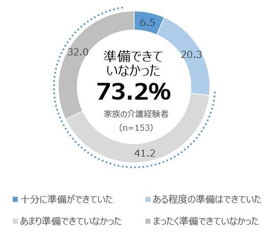 家族の介護経験がある153人に、家族の介護が始まった時点で介護に関する準備がどの程度できていたかと聞くと、41.2%は「あまり準備できていなかった」、32.0%は「まったく準備できていなかった」と答え、家族の介護経験者の73.2%、およそ4人に3人は準備ができていないまま介護生活が始まっています。