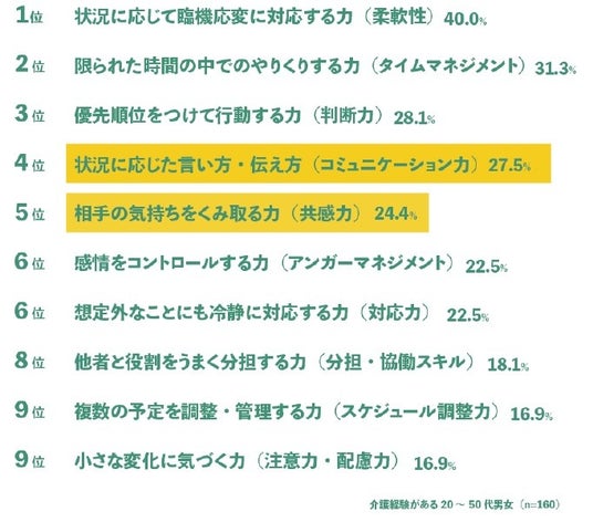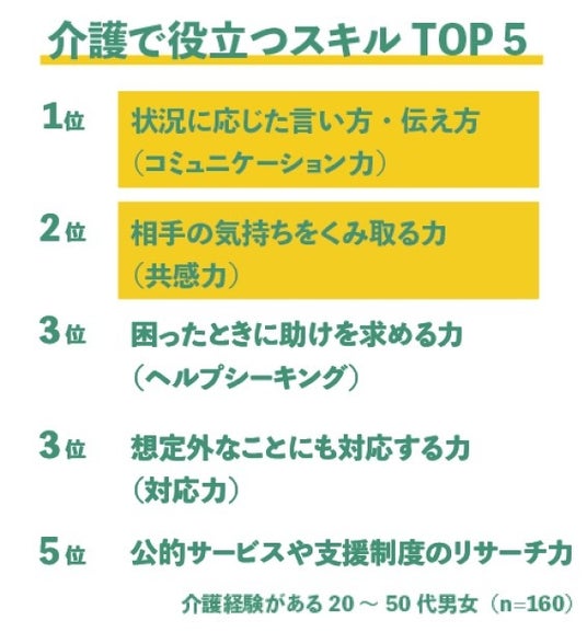 それぞれのTOP10を比較すると「コミュニケーション力」(仕事4位/介護1位)や「共感力」(仕事5位/介護2位)は仕事と介護の両方に役立つスキルとして、上位に挙げられました。