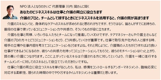 となりのかいご 代表理事 川内潤さん介護というと身体的ケアを想像しがちですが、それだけではありません。皆さんが仕事で培ってきた「共感力」や「コミュニケーション力」も、介護の現場、特に介護に関わる介護のプロの方々とやりとりをする場面でとても大きな力になります。