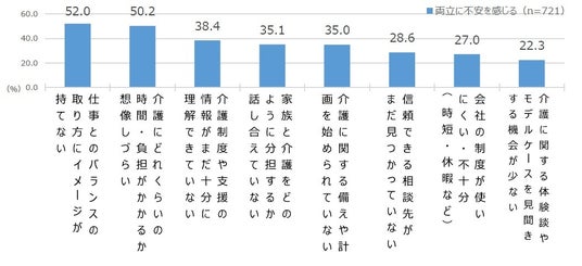 バランスの取り方にイメージが持てない」(52.0%)、「介護にどれくらいの時間・負担がかかるか想像しづらい」(50.2%)が約5 割と高く、次いで「介護制度や支援の情報がまだ十分に理解できていない」(38.4%)、「家族と介護をどのように分担するか話し合えていない」(35.1%)、「介護に関する備えや計画を始められていない」(35.0%)が上位に挙げられました。