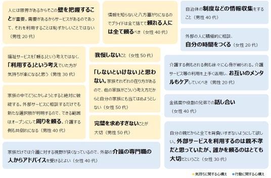 家族の介護経験者に、これから介護を始める人へのアドバイスや心構えを聞くと、「自分で出来ない事を決断するのも勇気」(男性20代)、「(介護を)自分の義務だとか責任と思うのはやめてほしい」(女性30代)、「人の手に頼ることを悪いことだと考えない」(女性50代)などの精神面でのアドバイスや、「プロの手を借りた方がいい。家族だけで抱え込まない方がお互いのため」(女性30代)、「元気なうちに先の事を話し合っていたほうが良い」(男性40代)、「振込先が分かる通帳や不要なものの解約など早めにしておいたほうが良い」(女性40代)、「相談できる人を作っておく」(男性50代)などの現実的なアドバイスまで、介護経験者ならではの実感のこもったアドバイスが届きました。