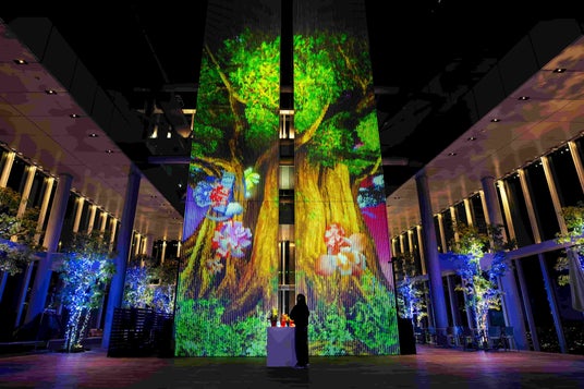 58F ツインタワー(58階「天空庭園」)プロジェクションマッピング&インタラクティブアート大阪芸術大学アートサイエンス学科の学生が企画・構成を担当したプロジェクションマッピング&インタラクティブ作品。映像に触れると演出が変化する来場者参加型の演出もお楽しみください。