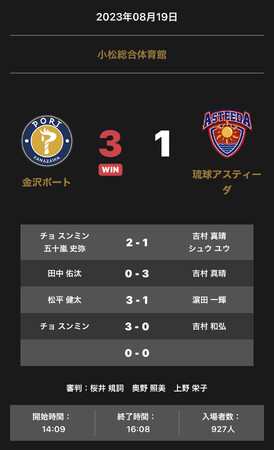 2023-08-20 一般社団法人Tリーグ ノジマTリーグ 2023-2024シーズン 公式戦 8月19日 開催 金沢ポート vs 琉球アスティーダ 試合結果 Tweet ノジマTリーグ 2023-2024シーズン 公式戦 8月19日 開催 金沢ポート vs 琉球アスティーダの試合結果は3-1で金沢ポートが勝利しました。 企業プレスリリース詳細へ PR TIMESトップへ 公式ツイッター Follow @Straightpress 最新情報をTwitterで受け取ろう! 公式フェイスブックページ 最新情報をFacebookで受け取ろう! 前の記事 一覧へ戻る 次の記事
