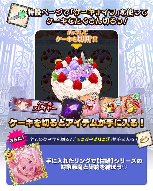 イベントの特設ページにて、イベントアイテム「ケーキナイフ」を使ってケーキを切ると、ケーキの中に隠れた報酬アイテムを獲得することができます。
