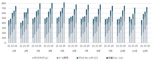 サブスクリプションは、CLIP STUDIO PAINT サブスクリプション売上です。ツール販売には、一括支払いモデルのダウンロード版や法人向けライセンスの売上などが含まれます。プラットフォームサービスには、CLIP STUDIO WEBサービスでの売上等が含まれます。流通ソリューションには、電子書籍及びDC3に関連する売上が含まれます。